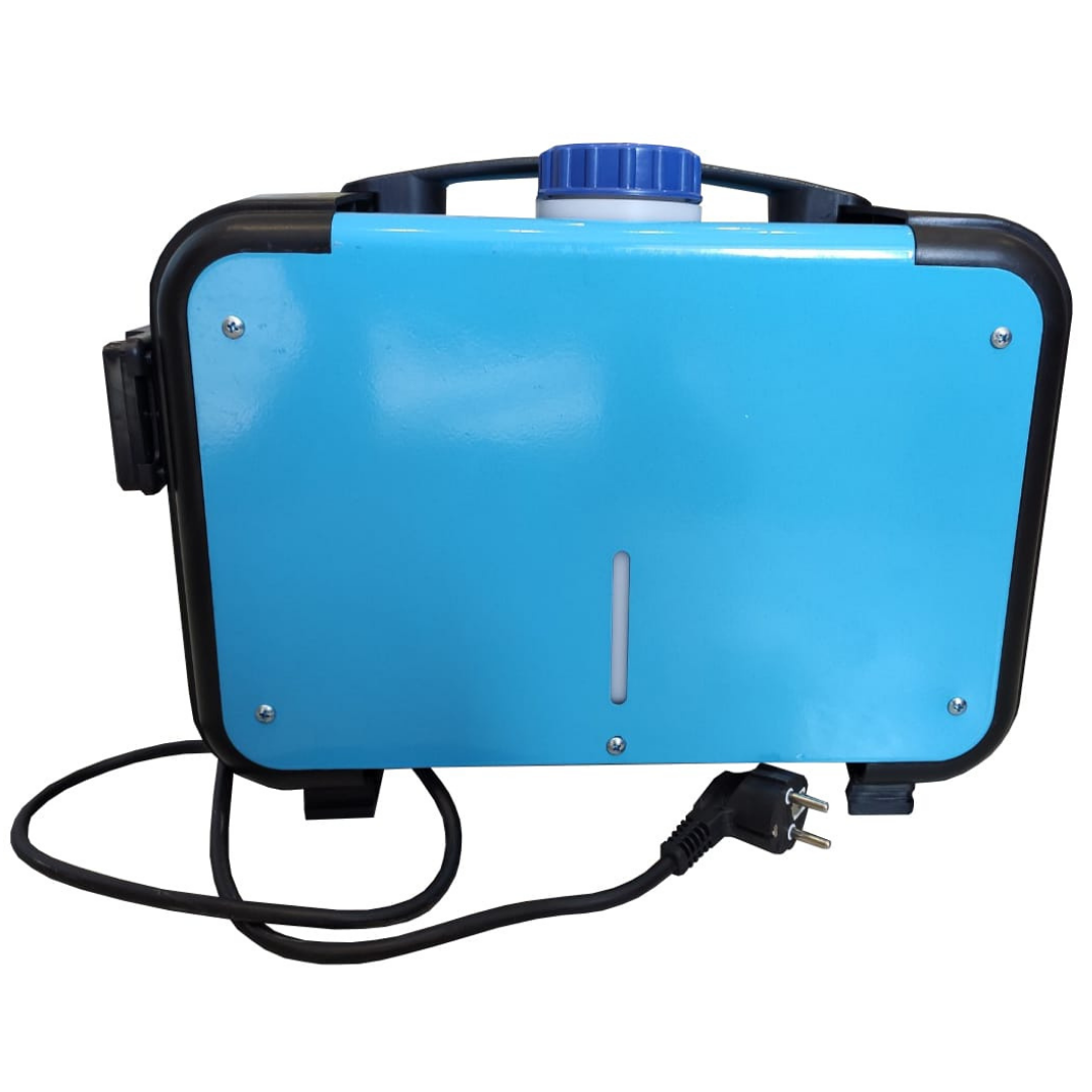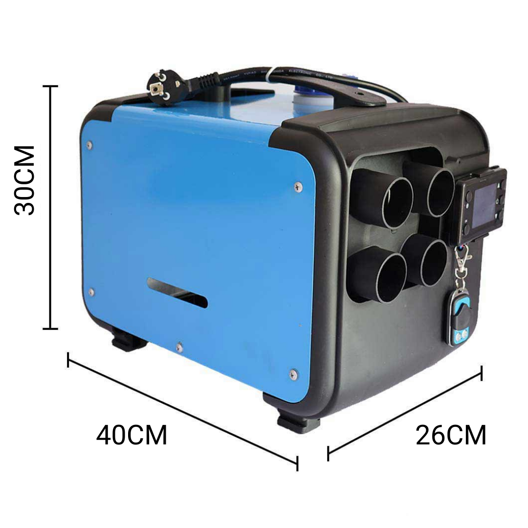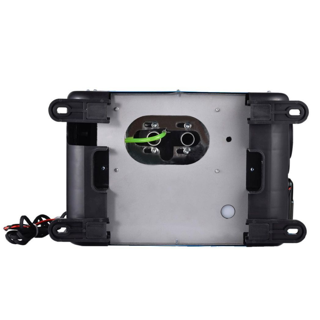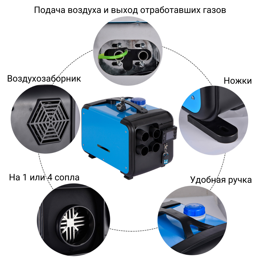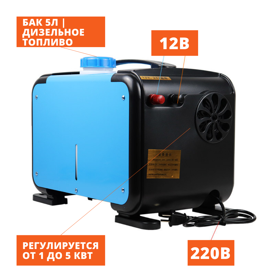Мощность обогревателя регулируется до 5,5 кВт. Отопитель работает на дизельном топливе и питается от обычной сети 220В или от аккумулятора 12В. Бак для топлива находится внутри корпуса отопителя, вся система собрана. Вам нужно только подключить питание.